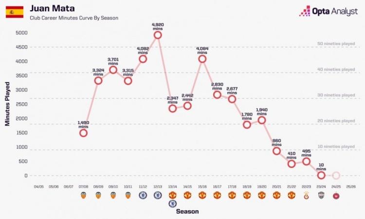 马塔在他职业生涯中,只有一个赛季的出场时间超过4000分钟——15/16赛季效力曼联之时——在那个赛季结束之时,年满28岁得他,影响力开始逐渐衰退。他在老特拉福德球场逐渐变得边缘化,出场时间越来越少,在关键战役中能够提供的力量也越来越弱。看看他在接下来几年里,出场时间是如何减少的,很自然会联想到他在12/13赛季之时“马拉松式”的赛程,是否起到了负作用。在短时间内踢了这么多比赛,是否让一名耐力并不是那么出众的明星球员走向了崩溃?
