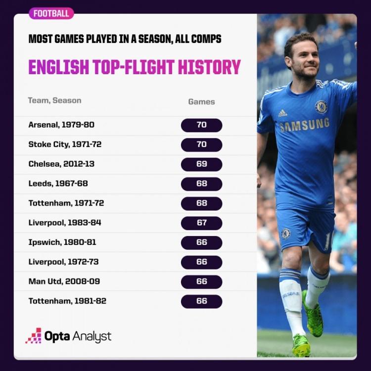 与此同时,英格兰足坛历史上有两支顶级联赛球队的比赛场次超过12/13赛季的切尔西,分别是71/72赛季的斯托克城和79/80赛季的阿森纳,当时这两支球队都踢了70场比赛。