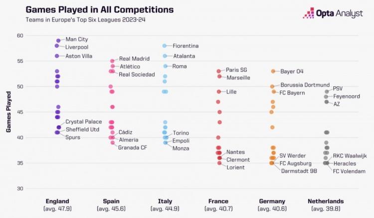 上赛季曼城在各项赛事中踢了59场比赛,这比欧洲六大联赛中的任何其他球队都要多。 而欧联杯的比赛则意味着像维拉(56场)和佛罗伦萨(58场)这样的球队也需要硬着头皮踢大量比赛——但大多数球队的比赛都少于50场。五支球队英超球队只踢了42场比赛,而这6个联赛中有36支球队的比赛少于40场。对于欧洲大部分联赛的球队来说,球员都不会有应对密集赛程的问题。