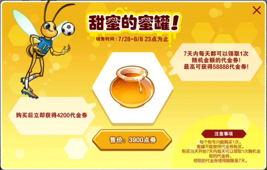 重磅福利,超额返点!甜蜜的蜜罐活动将于7月28日暖心上线!只需3900点券即可立即获得4200代金券返还,外加七天的随机金额代金券领取机会,最高可获得58888代金券!祝各位FSFER都能收获满满代金券福利!