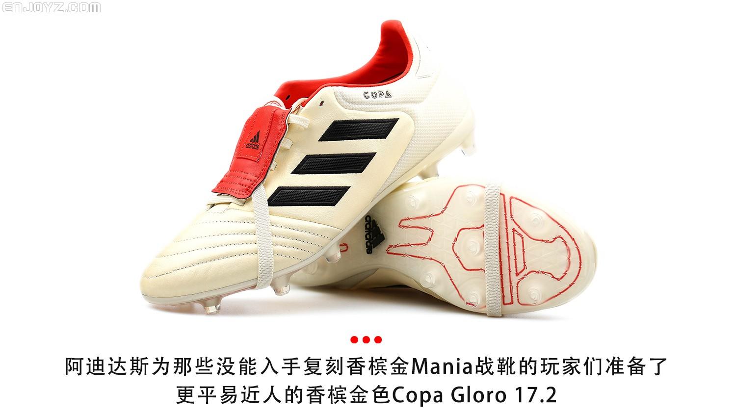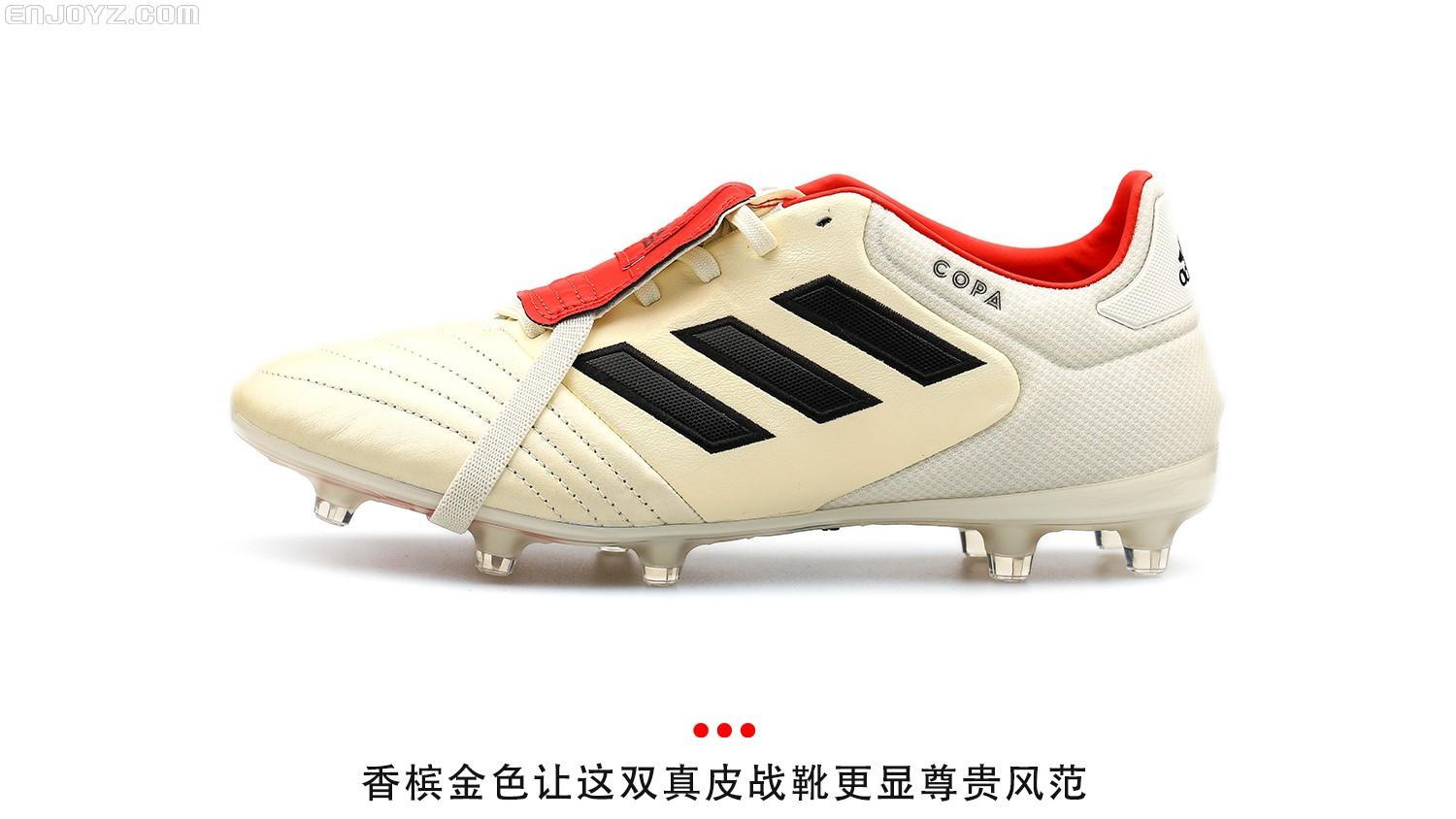 过去的5月份,最热门的鞋款当属阿迪达斯“Champagne Pack”足球鞋套装中的复刻版本Predator Mania足球鞋。这双采用全新设计复刻的香槟金色战靴从正式亮相的那天起就征服了不少玩家。不过限量发售与之后市场高居不下的价格让玩家们望而却步。不过还好,阿迪达斯在这一套装中为玩家们准备了一双既不限量也不高价的Copa Gloro 17.2足球鞋。香槟金色真皮鞋面搭配红色可翻折大鞋舌,无论外形还是神韵都让人依稀看到Predator Mania的影子。“新品赏析”今天带各位没有买到Predator Mania的EZer们一同欣赏这双能让你感受香槟金色魅力的实战好货。