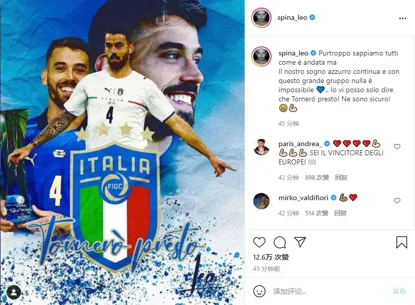 而在这批冠军球员逐渐淡出国家队阵容后,意大利队明显青黄不接,不但星味不足,甚至连颜值都令很多女球迷逐渐对曾有 “欧洲男模队” 之称的意大利队失去了兴趣。再加上德国世界杯后,欧洲足坛乃至世界足坛为西班牙的传控足球所统治,蓝衣军团不但进攻乏力,连稳健的防守也不复存在,最低谷时期,意大利无缘 2018 年俄罗斯世界杯。而俱乐部层面,意甲相对于英超、西甲的式微,更让球迷们不看好现在的意大利队。没想到,曼奇尼率领一批在俱乐部都算不上顶级大牌的年轻人,打出了不错的比赛。不过,左后卫斯皮纳佐拉在连续几场的优异表现后突遭重伤,对意大利队的排兵布阵影响不小。如今也只能在祝愿他早日康复的同时,期待这次意外能给团队注入更多共同战胜困难的团结力量。
