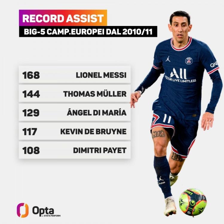 直播吧4月22日讯 数据网站OPTA盘点自10/11赛季以来五大联赛球员助攻次数,梅西送出168次助攻独占鳌头,穆勒、迪马利亚分列二三位。