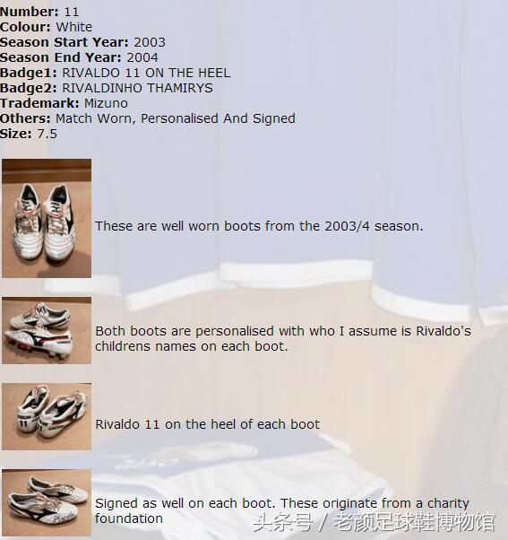 巴西鬼才里瓦尔多,一直使用非主流的足球鞋,mizuno是其巅峰时期使用的战靴。据说他的mizuno足球鞋尺码居然是uk7.5,也就是41码jp265,不过不知道是否确切,毕竟1米86的个子呢。