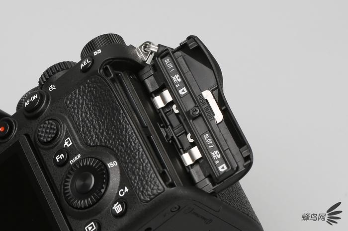 索尼α9 II此次仍然采用了两个SD卡卡槽位,并且这两个卡槽都支持UHS-II高速存储。值得注意的是,此次索尼α9 II同样和此前的索尼α7R IV将卡槽1/2的位置进行了对调,并且更改了卡槽的开启方式。