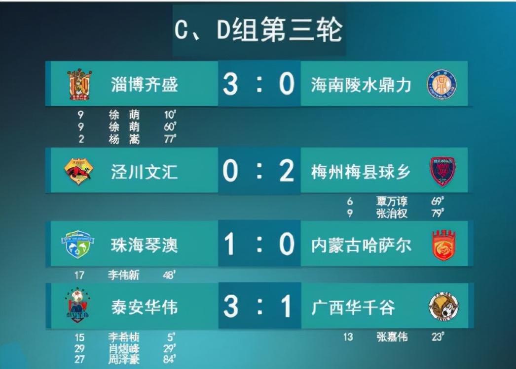 结果,梅县球乡2-0战胜泾川文汇,但海南陵水鼎力刚好0-3输给了淄博齐盛,最终梅县球乡被淄博齐盛以1个净胜球神奇反超被淘汰出局,而海南陵水鼎力仍然能以小组头名出线,淄博齐盛则以小组第2的身份出线。