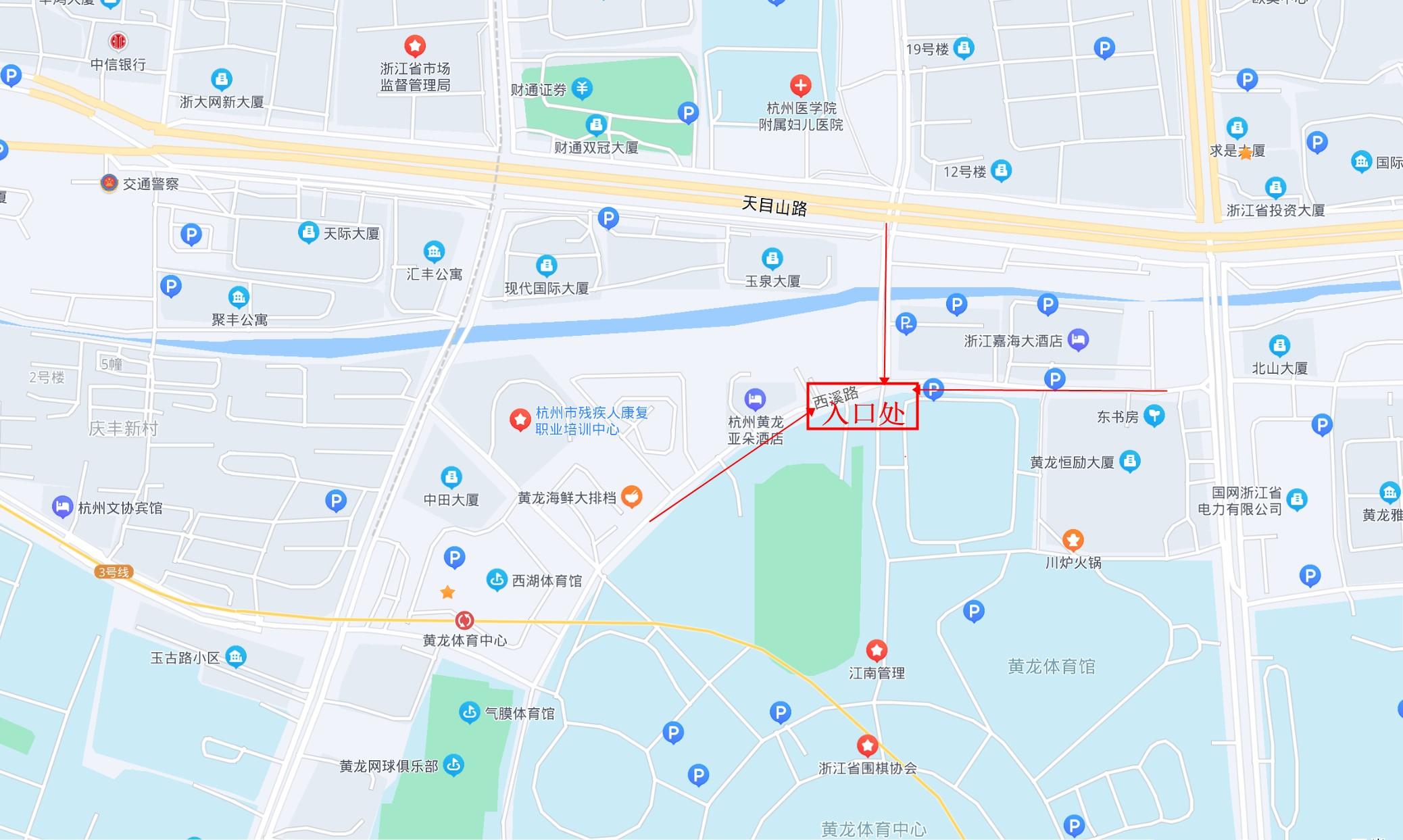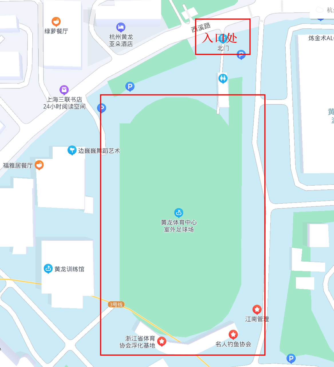 黄龙室外足球场行驶路线图,停车可以停在西溪路边侧停车位,也可以停到黄龙体育中心内,停车费都是5元/小时