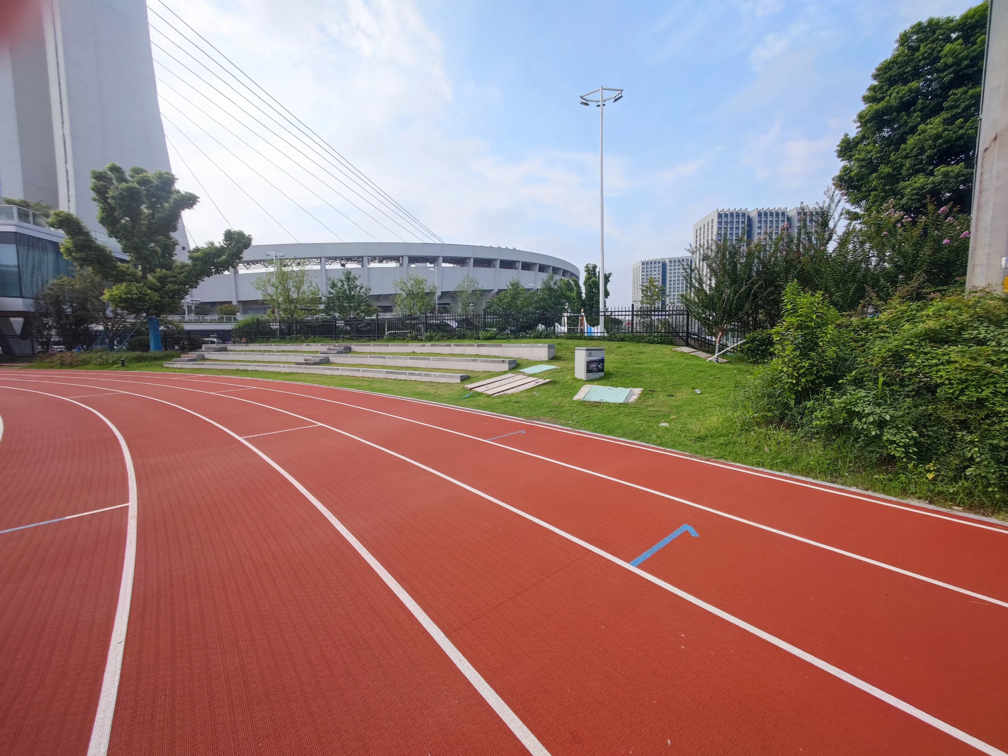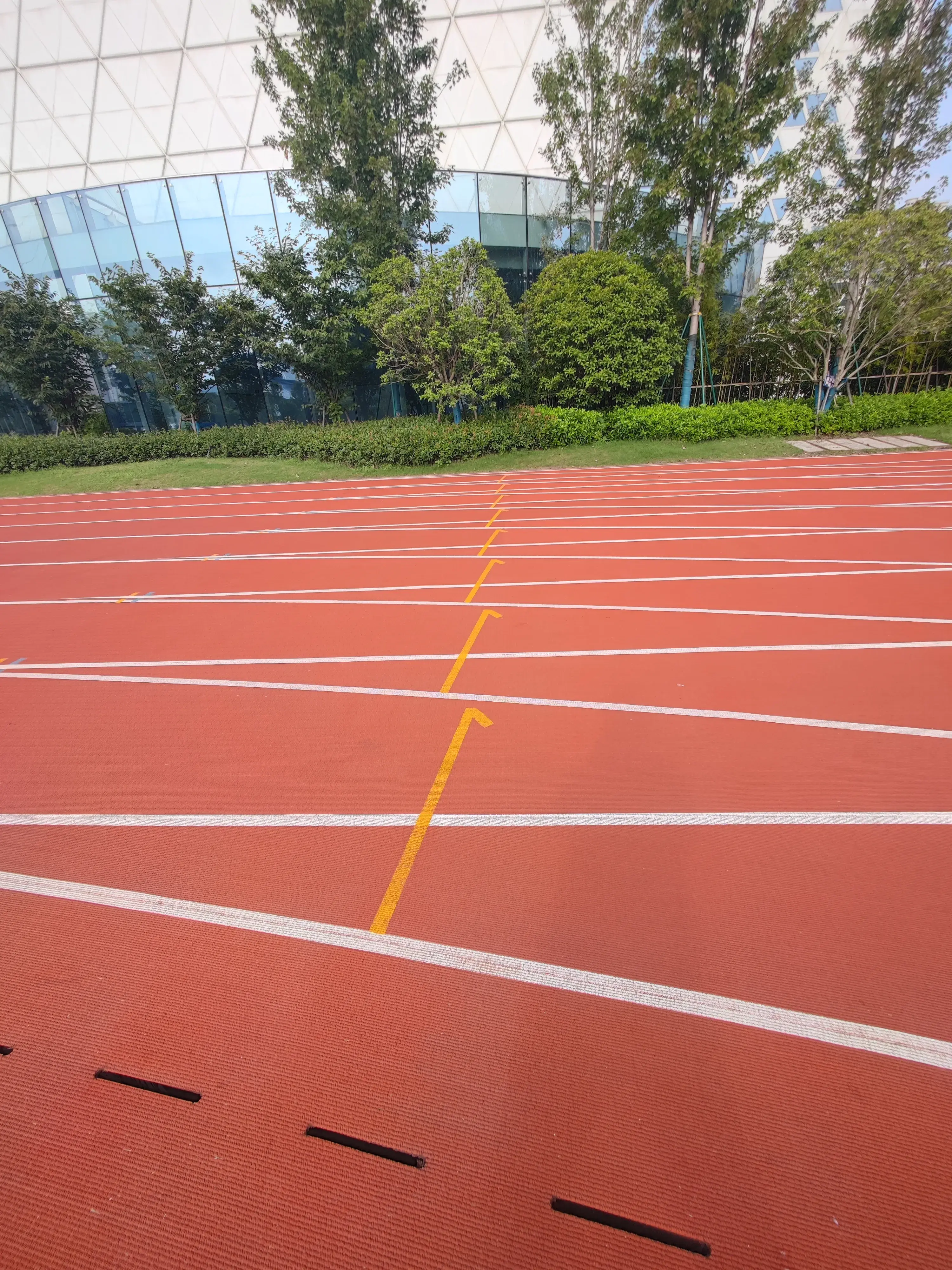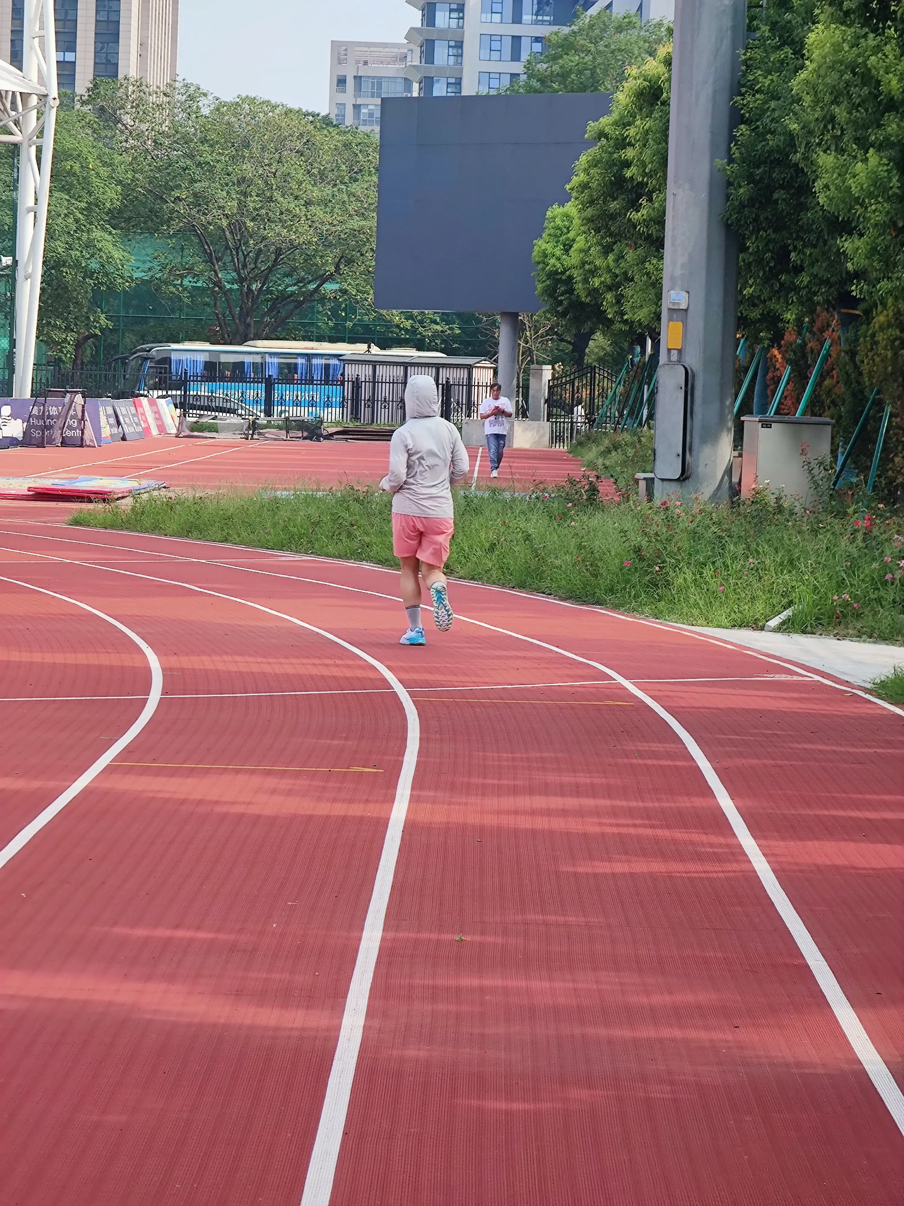 这是一条标准的塑胶跑道,路面很软,跑步不会伤膝盖和脚后跟