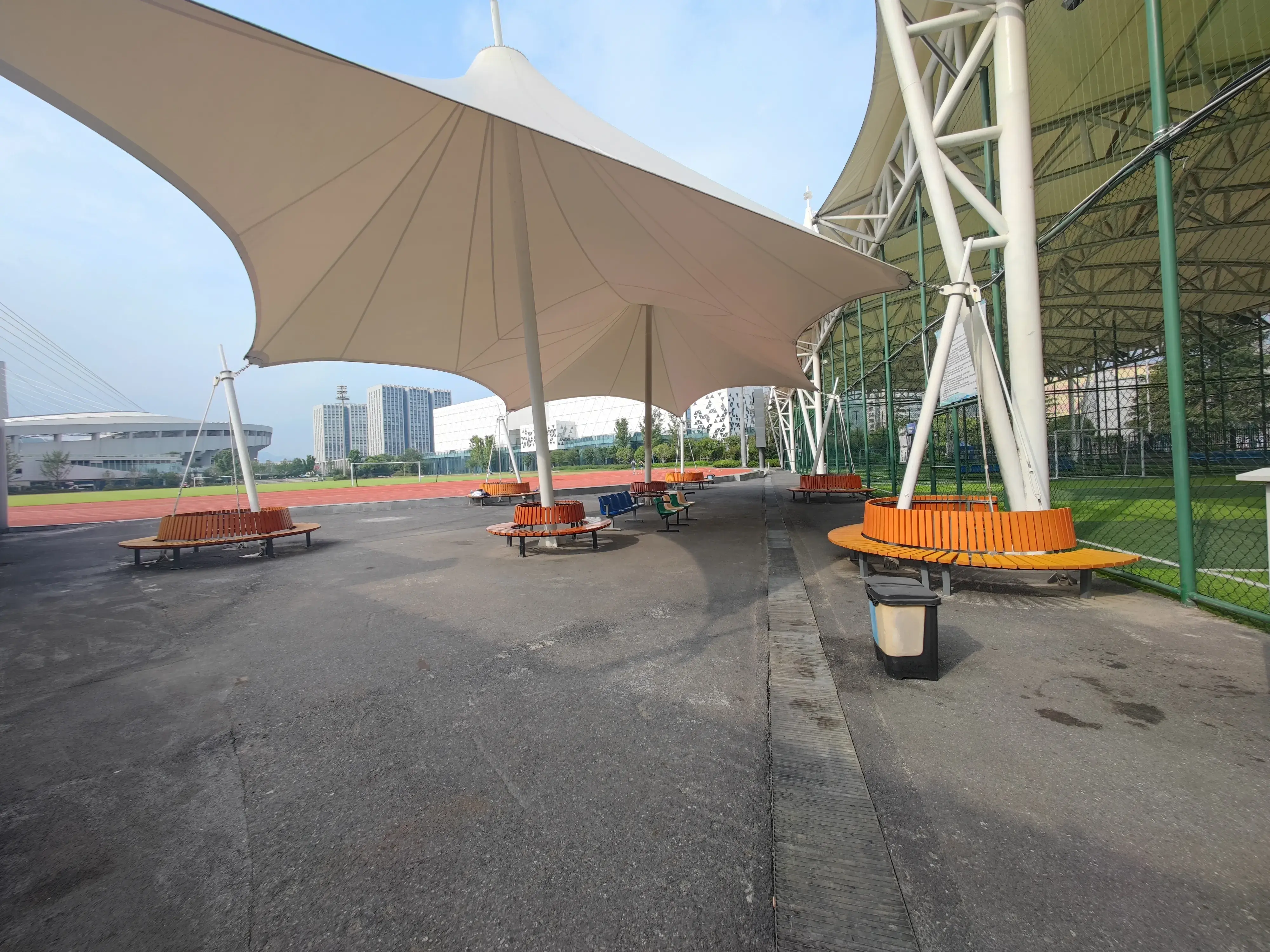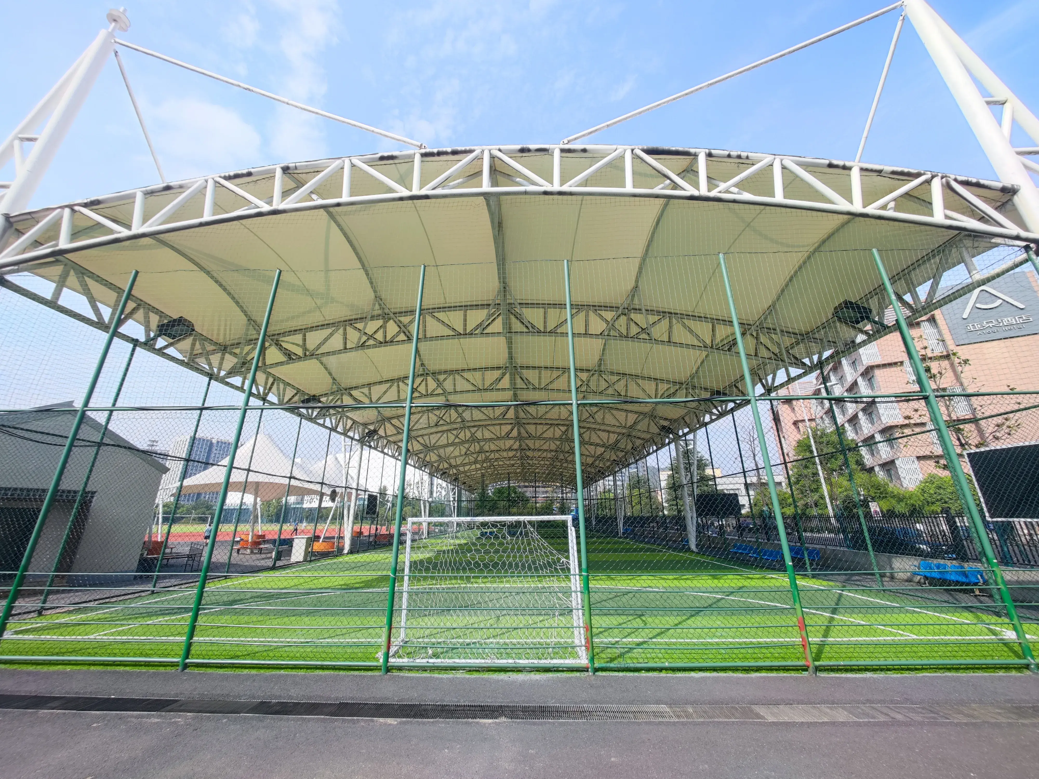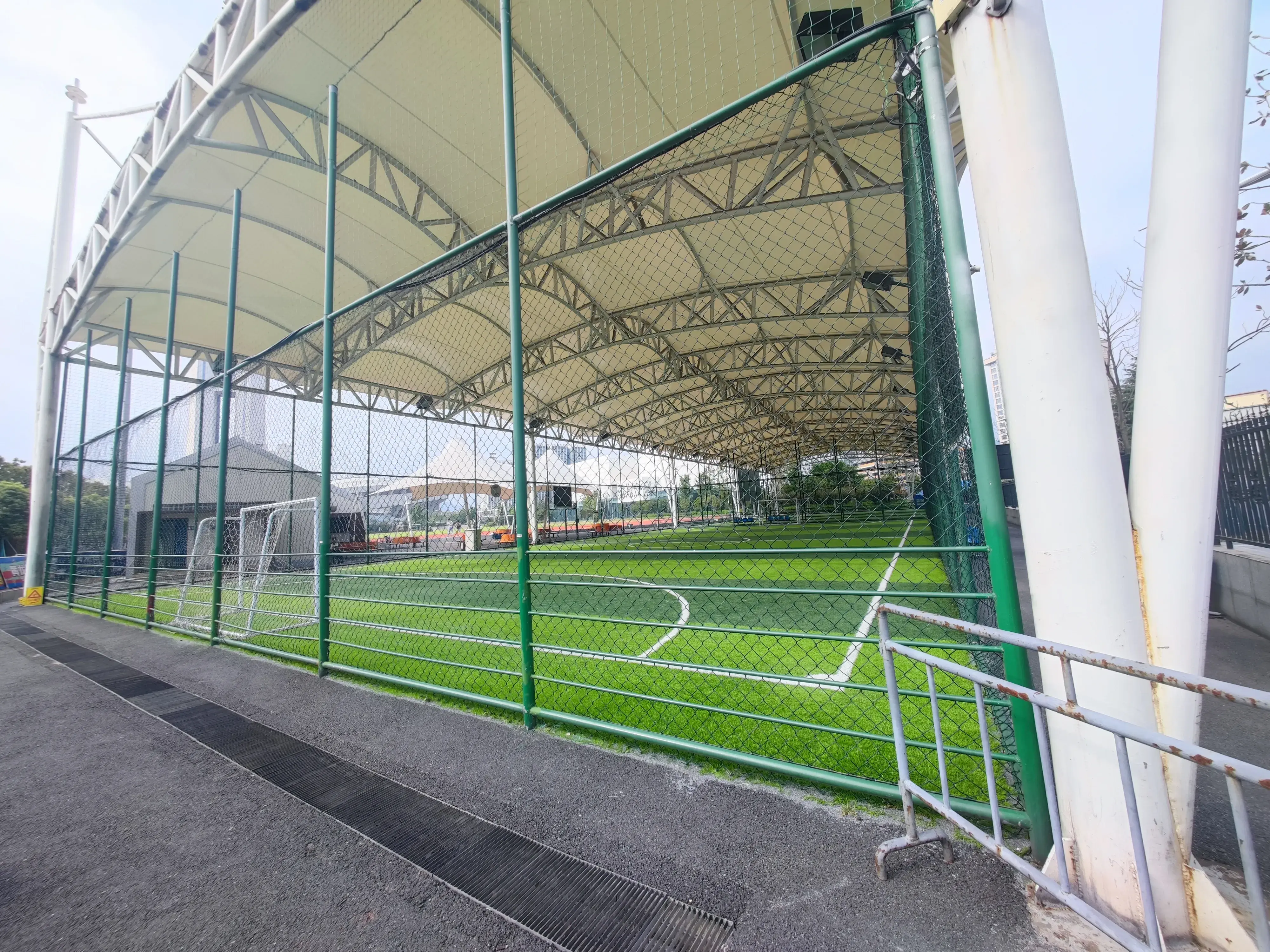 室外足球场和笼式室内足球场中间是开放式休息区