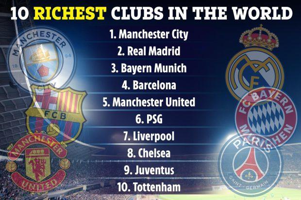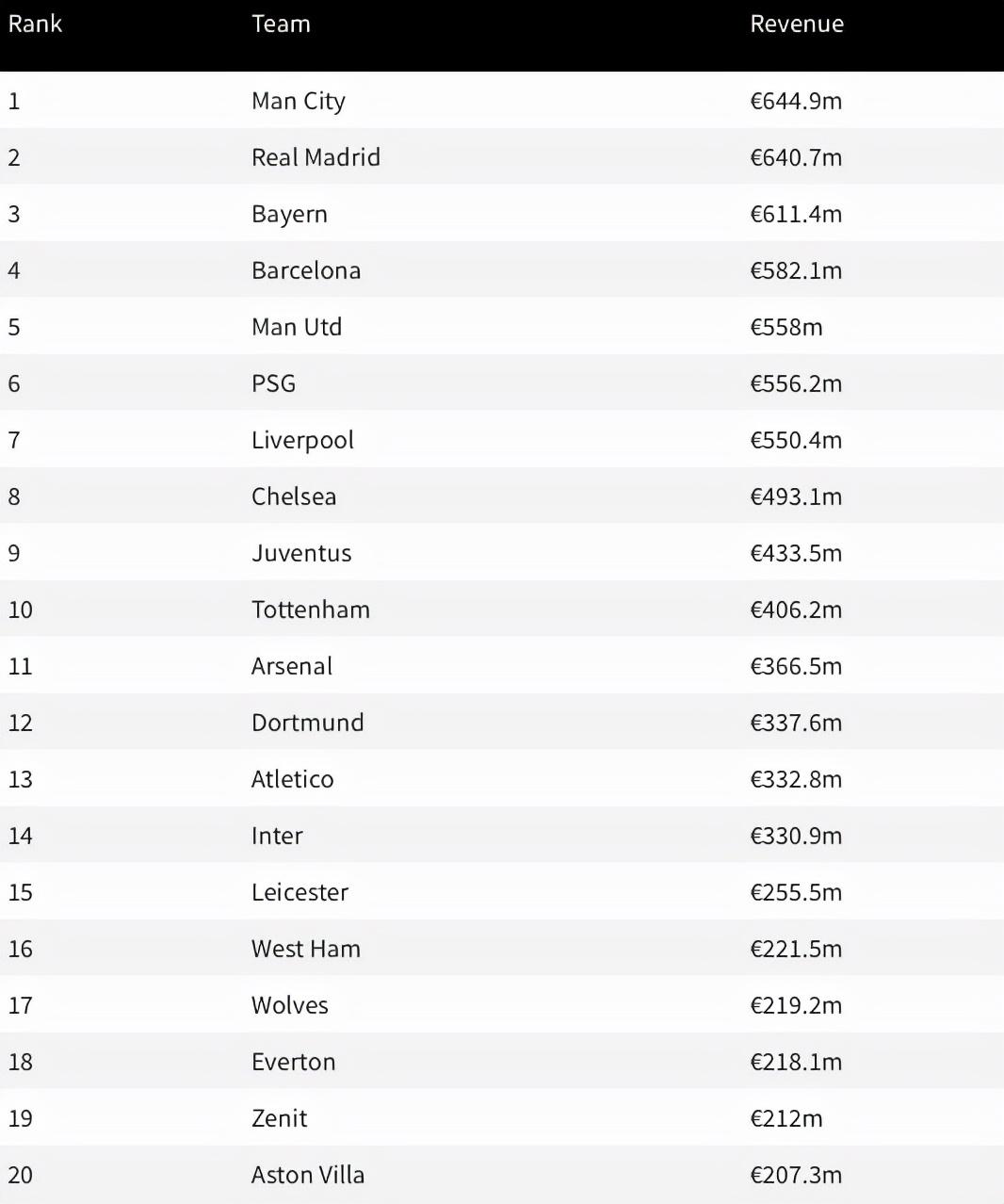 曼城、皇马、拜仁、巴萨和曼联占据榜单前五名,大巴黎第六位,利物浦、切尔西、尤文和热刺则排在第7-10位。第11-20名中,英超球队则占据了六席。阿森纳第十一,莱斯特城第十五,狼队首次进入榜单排在第十七位,此外还包括了多特、国米、马竞和圣彼得堡泽尼特。