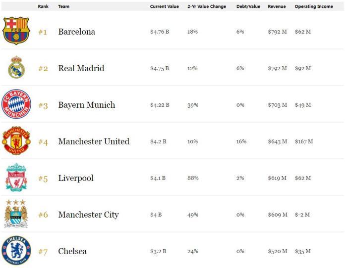 《福布斯》上一次盘点足坛最具价值俱乐部排行是在两年前,当时皇马排名第一,如今他们已经被死敌巴萨反超。