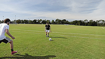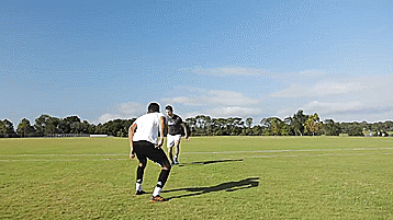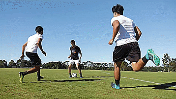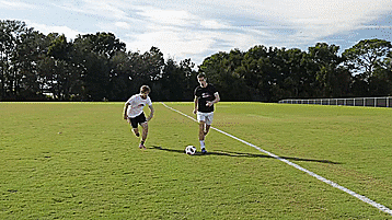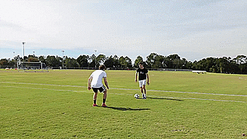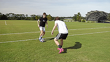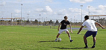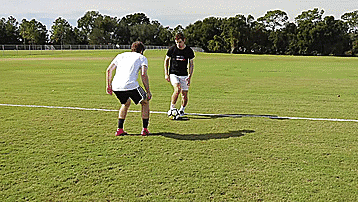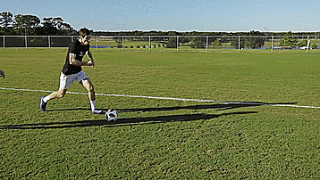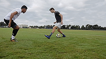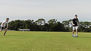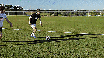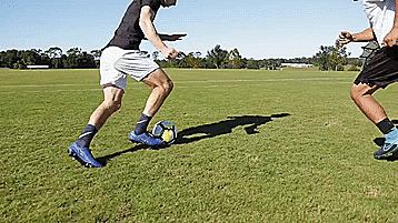 如果防守队员上前封堵传中线路,我们用脚内侧切球将球从腿后变向。