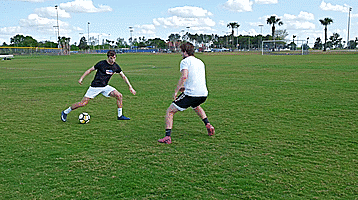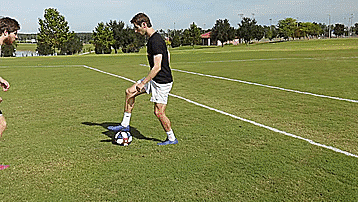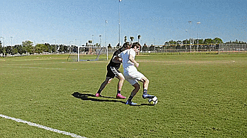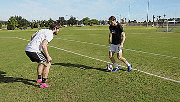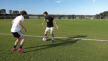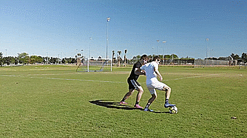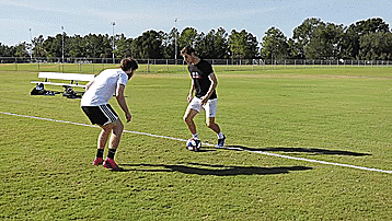 我们用脚底快速将球拉回来,然后用脚内侧推球从防守队员支撑脚侧摆脱防守队员。