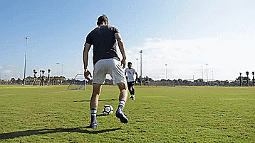 当我们看见一名防守队员正在快速向你逼近,你可以将脚的外侧边缘插入球底,然后将球挑起越过防守队员头顶。