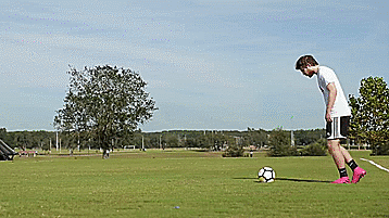 最后再用这只脚的脚尖推球穿过支撑腿到另一个方向。