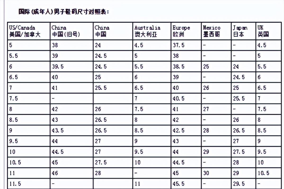 国际男鞋尺寸对照表