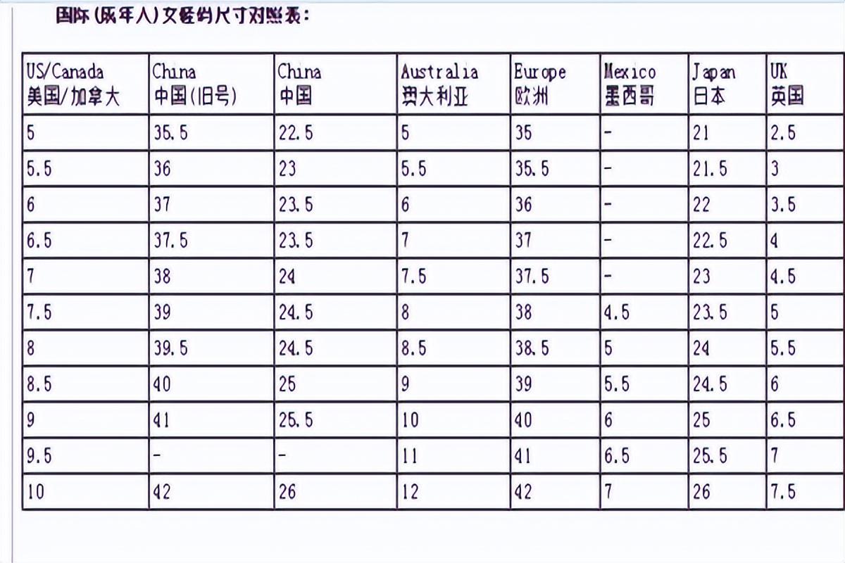 国际女鞋尺寸对照表