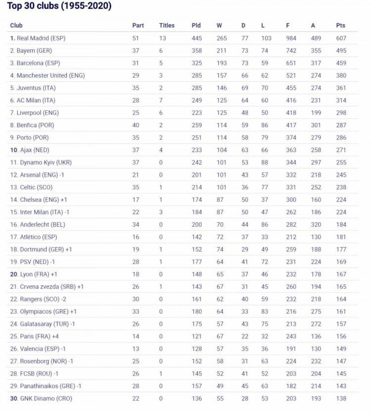 1955年-2020年欧冠排名Top30俱乐部如下(官方列表如下↓,中文数据列表额外补偿关注度较高的曼城和热刺↑):
