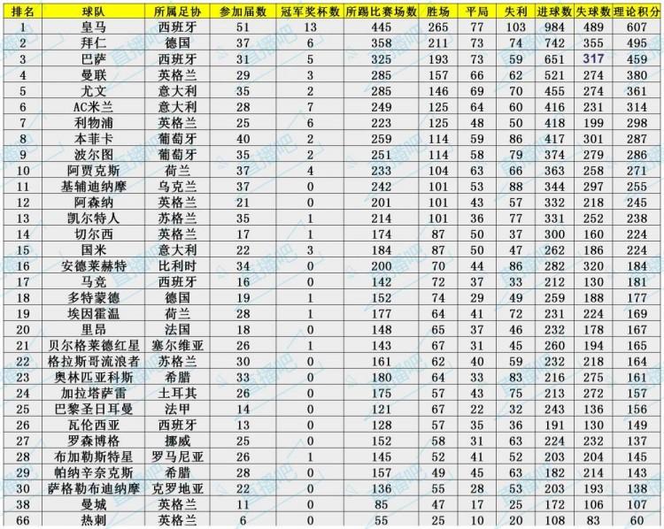 欧冠自创立1955年创立以来,已经成为了欧洲层面乃至世界上最顶级的俱乐部赛事之一,能够在欧冠的历史中占据自己的地位是对一家欧洲俱乐部成就的最大肯定。欧足联目前公布了自成立以来至今的欧冠球队积分总榜,
