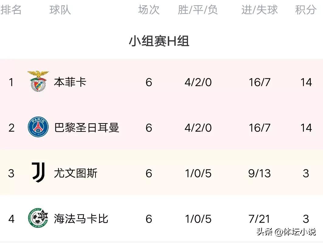 H组结束了两比赛,最大的看点就是谁能拿到小组第一,结果巴黎和本菲卡双双赢球,巴黎是2-1险胜尤文,而本菲卡则是狂轰6-1的比分大胜海法马卡比,这样一来两队的战绩都是4胜2平,非常罕见的同积14分,而本菲卡依靠客场进球较多的优势力压巴黎锁定第一,不得不说两队的第一之争真的是太戏剧性了,巴黎拿到小组第二淘汰赛估计是难了!