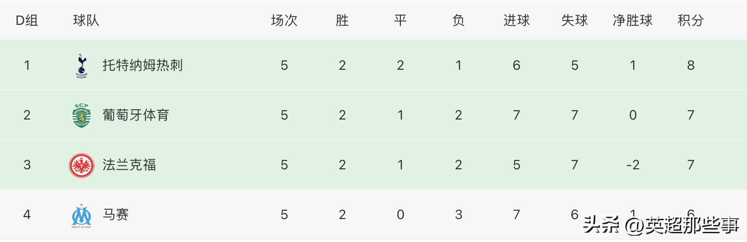 D组末轮结束了两场比赛,本组堪称死亡小组,直到末轮4队都有出线机会,结果热刺在先丢一球的情况下,依靠霍伊别尔的进球2-1读秒绝杀逆转马赛,不仅拿到了出现权,还抢到了小组第一,而法兰克福同样也是先丢一球,依靠镰田大地和穆阿尼的进球2-1逆转葡萄牙体育,拿到了小组第二,这样一来热刺和法兰克福拿到了出线权,最终排名热刺锁定第一,法兰克福第二,葡萄牙继续第三,马赛垫底出局!