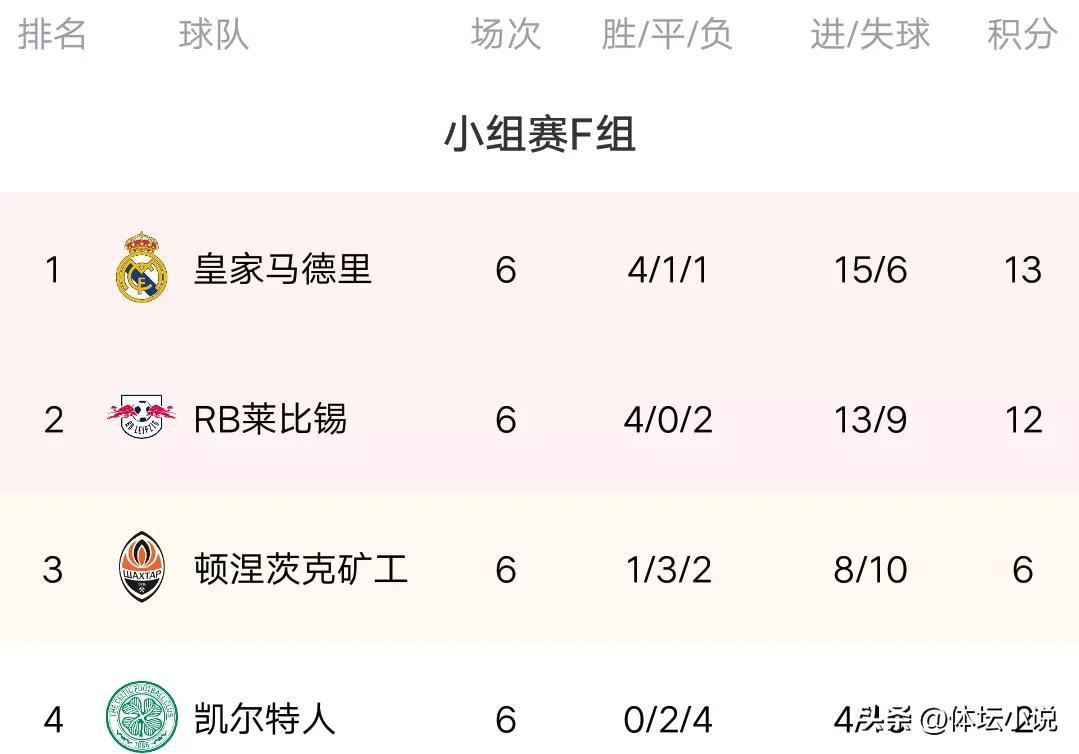 F组末轮结束了两场比赛,已经出现的皇马面对已经出局的凯尔特人,结果有着头名之争压力的皇马打出了一场碾压之战,全场攻势如潮,狂轰25脚射门依靠莫德里奇,罗德里戈,阿森西奥,维尼修斯和巴尔韦德的进球5-1击败了对手,成功拿到了小组第一。另外一场比赛,莱比锡红牛和矿工迎来了出线生死大战,结果莱比锡红牛直接踢疯了,全场摁着矿工爆揍,结果酣畅淋漓的轰出4-0的比分,以小组第二晋级16强!