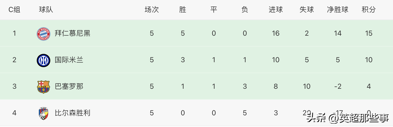 C组末轮结束了两场比赛,已经提前拿到欧冠的拜仁和国际米兰进行比赛,本场比赛没有任何意义,结果拜仁延续了连胜势头,2-0完胜国米,强势轰出6连胜,是本届欧冠小组赛唯一一支6连胜的球队,攻守兼备真的是太强了。而巴萨面对垫底的比尔森胜利,最终以4-2的比分笑到了最后,成功拿到小组第三,杀进欧联杯,本组最终排名拜仁第一,国米第二,巴萨第三,比尔森胜利垫底!