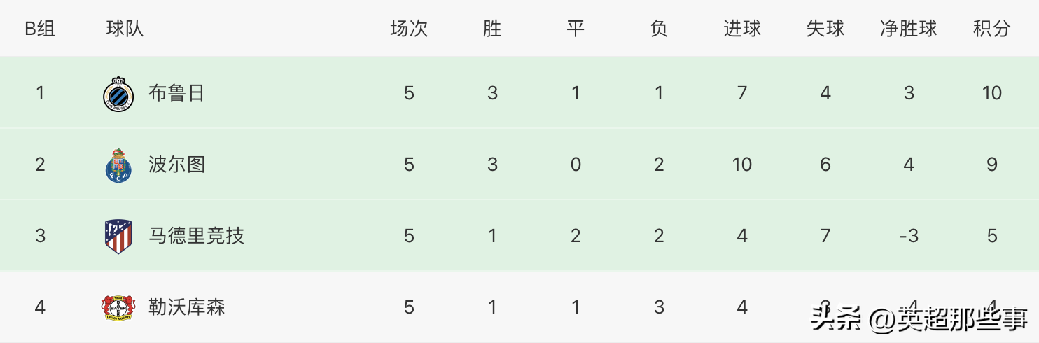 B组中,波尔图客场4-0大胜布鲁日,取得小组赛3连胜,提前一轮出线,布鲁日遭到首败,且首次丢球,但仍居榜首;马竞主场2-2战平勒沃库森,两队双双出局,将在最后一轮争夺欧联杯资格。