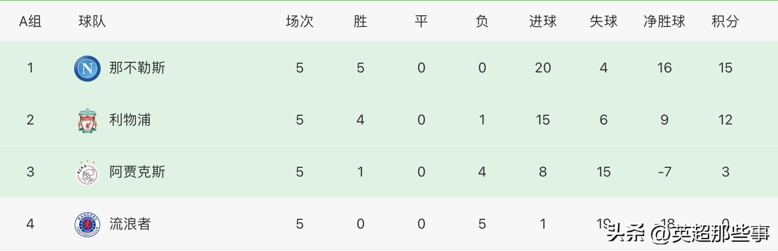 A组末轮结束了两场比赛,已经提前出线的那不勒斯和利物浦上演了强强对话,结果那不勒斯战意不佳,利物浦依靠萨拉赫和努涅斯的进球,利物浦2球主场完胜那不勒斯,拿到5连胜,同时送给那不勒斯欧冠首败。另外一场比赛阿贾克斯和垫底的流浪者争夺欧联席位,结果阿贾克斯火力全开轰出3-1击败了对手,这样一来A组的排名确定,那不勒斯以净胜球优势力压利物浦排名第一,两队携手杀进欧冠,阿贾克斯第三晋级欧联,流浪者垫底出局!