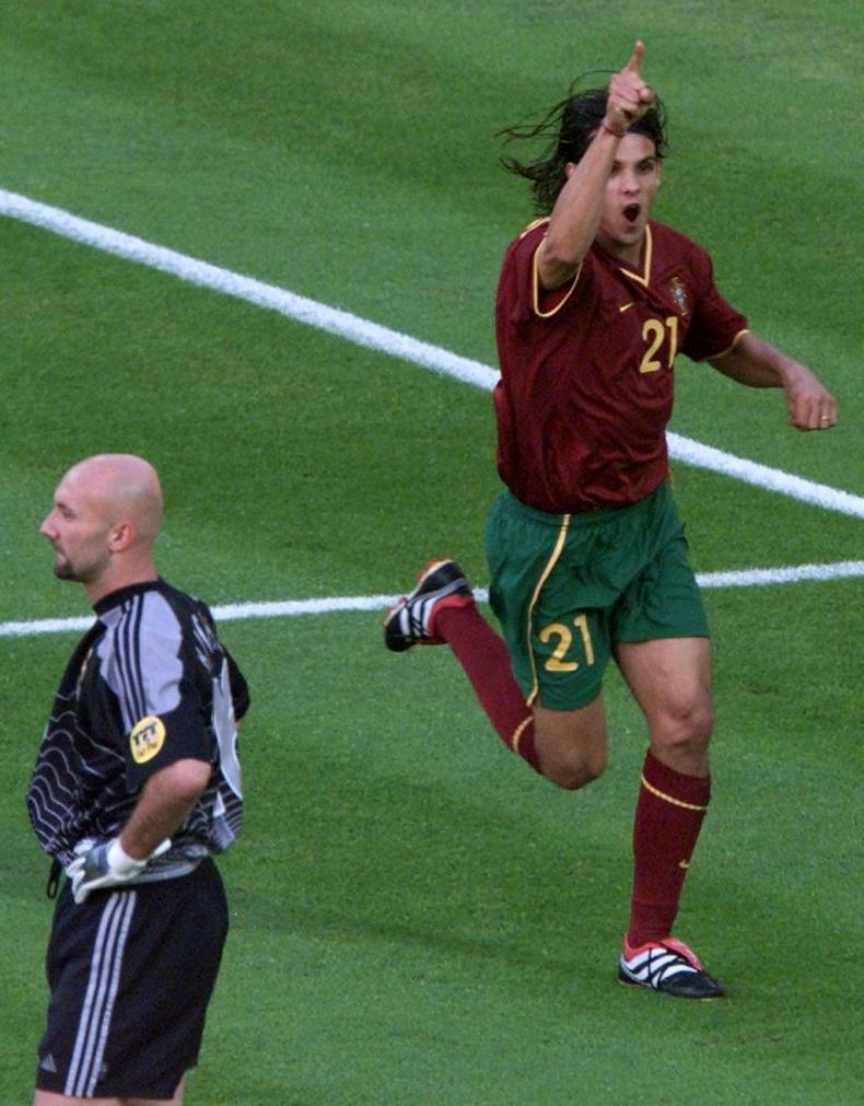 面对齐达内领衔的近乎完美的法国队,面对布兰科、德塞利、图拉姆、利扎拉祖组成的超级防线,努诺·戈麦斯全无惧色。第19分钟,法国队长德尚在康西卡奥的逼抢下大意丢球,在禁区外几乎是背对着球门的努诺·戈麦斯抢在法国队防守队员之前启动,左脚迎着来球,不作任何调整,转身就是一记倒地兜射。这记射门打得极其突然,以至于法国队光头门将巴特兹作出的唯一反应,就像1997年四国邀请赛上面对巴西队后卫罗伯托·卡洛斯那记40米开外的大力任意球一样——原地站着、侧身目送皮球入网,只是这次换了方向。1-0!进球后的努诺·戈麦斯一路飞奔、高声呐喊,法国队则在整个上半场士气低落、发挥失常。
