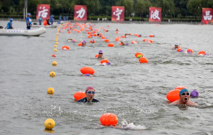 活动中,不论年轻年老,大家都扎进水里奋勇向前。在终点,第一个上岸的是来自江北竞赛队的杜先生,这是他第一次参加“横渡姚江”的比赛,“在自然水体里游泳还是有些不适应,不过水质不错,水温也很适宜。”