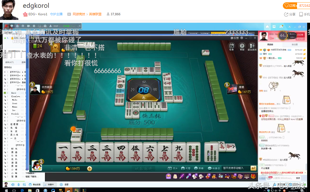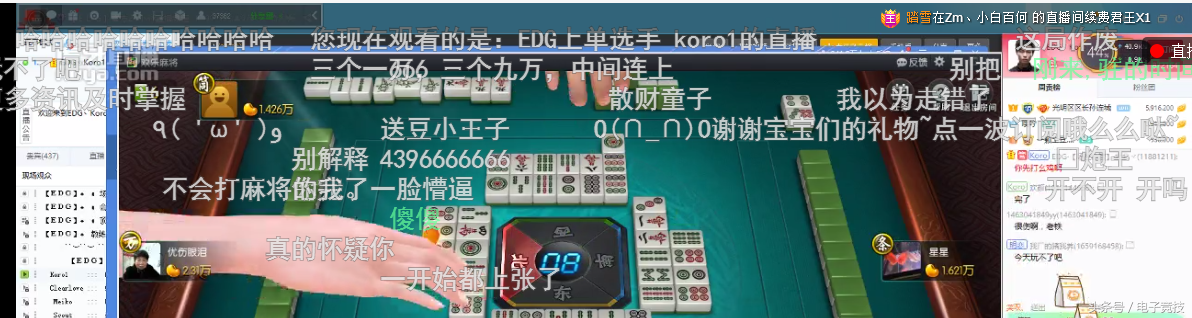 队员Koro1在放假期间在直播间直播起了打麻将。
