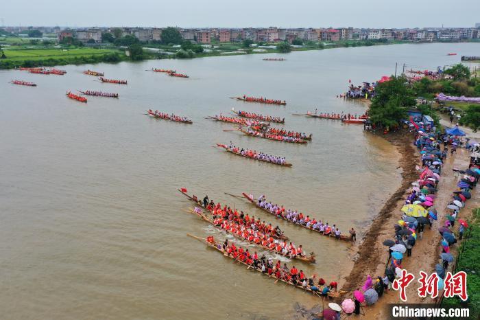 6月22日,在江西省上饶市余干县信江支流水域,数十条龙舟逐浪竞渡,吸引众人冒雨观看。 刘占昆 摄
