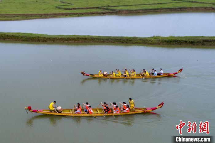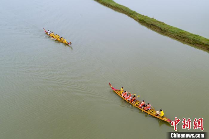 6月22日,鄱阳湖畔的江西省庐山市蛟塘镇槎垅村,村民们自发组织“村运会”开展龙舟赛庆祝端午佳节。 韩俊烜 摄