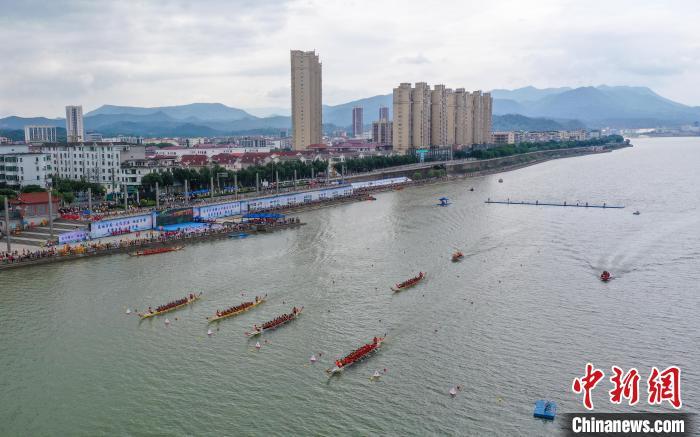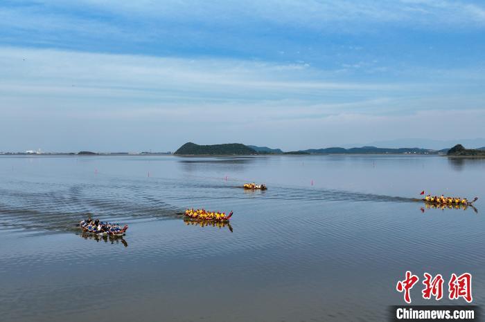 6月11日,江西湖口县“鄱湖竞渡”龙舟赛在中国·江豚湾景区水域(南北港)举行。 胡融 摄