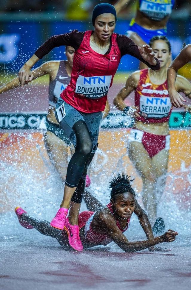 还有一些满意的图片,来源于我之前的拍摄经验,比如女子 3000 米障碍,运动员要跨栏、过水坑,在陆地比赛中有水的元素,看起来比较特别,所以我一般都会守在运动员过水坑的位置,看能否拍到一些内容,恰巧拍到了一名选手摔倒的瞬间。