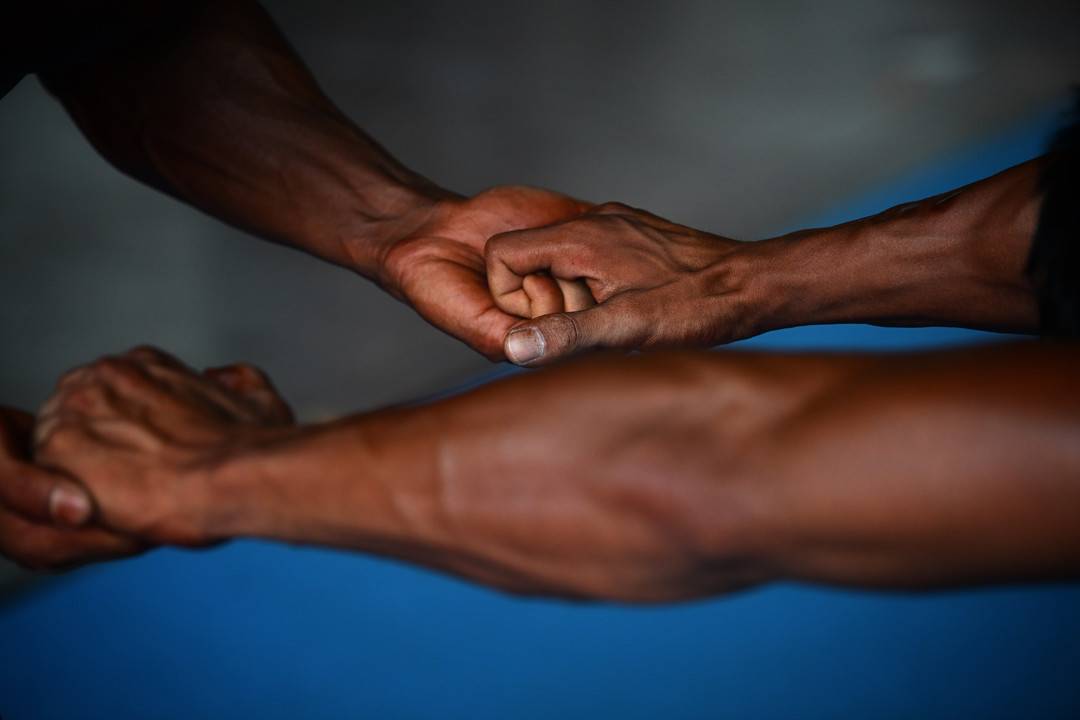两兄弟正在赛前相互协助热身。陈羽啸摄