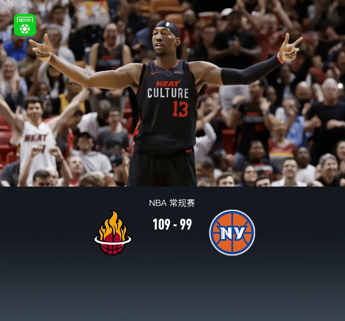 第四节热火海史密斯拿下7分,尼克斯迪文琴佐拿下8分,最终热火109-99战胜尼克斯