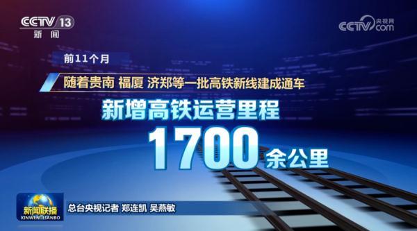今年以来,国铁集团以联网、补网、强链为重点,高质量推进铁路规划建设。前11个月,全国铁路完成固定资产投资同比增长7.4%。随着贵南、福厦、济郑等一批高铁新线建成通车,新增高铁运营里程1700余公里,“八纵八横”高铁网越织越密。