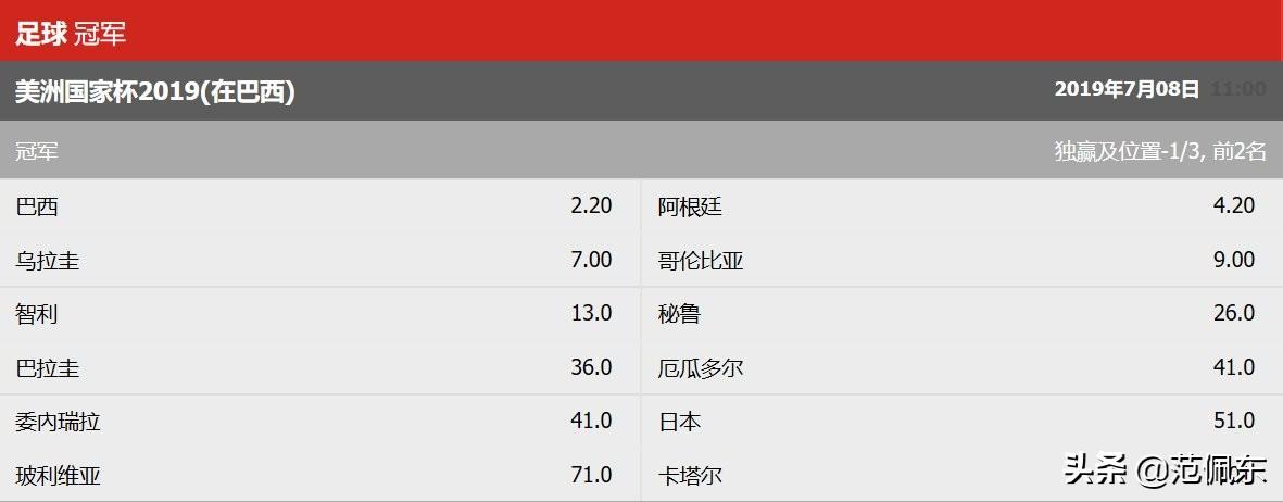 美洲杯数据比较统一,除东道主球队外,两个方向大家可以参考: