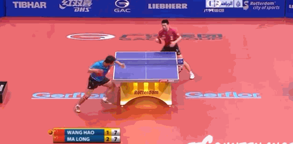 马龙发球,王皓正手搓球,马龙再搓下网,7-5,王皓拉开了分差。