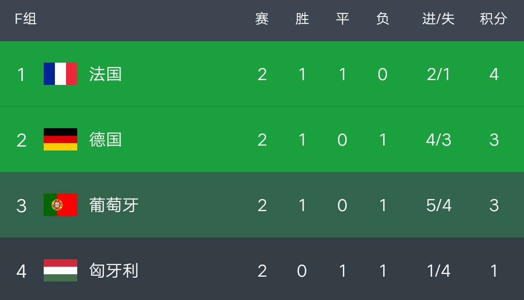 北京时间6月20日,欧洲杯小组赛F组第2轮比赛全部结束,其中法国队爆冷1-1战平匈牙利,德国4-2大逆转葡萄牙,这样的结果也让死亡之组的出线变得异常的复杂,目前在最新的积分榜上,法国队4分领跑,德国3分第二,葡萄牙3分第三,匈牙利垫底!