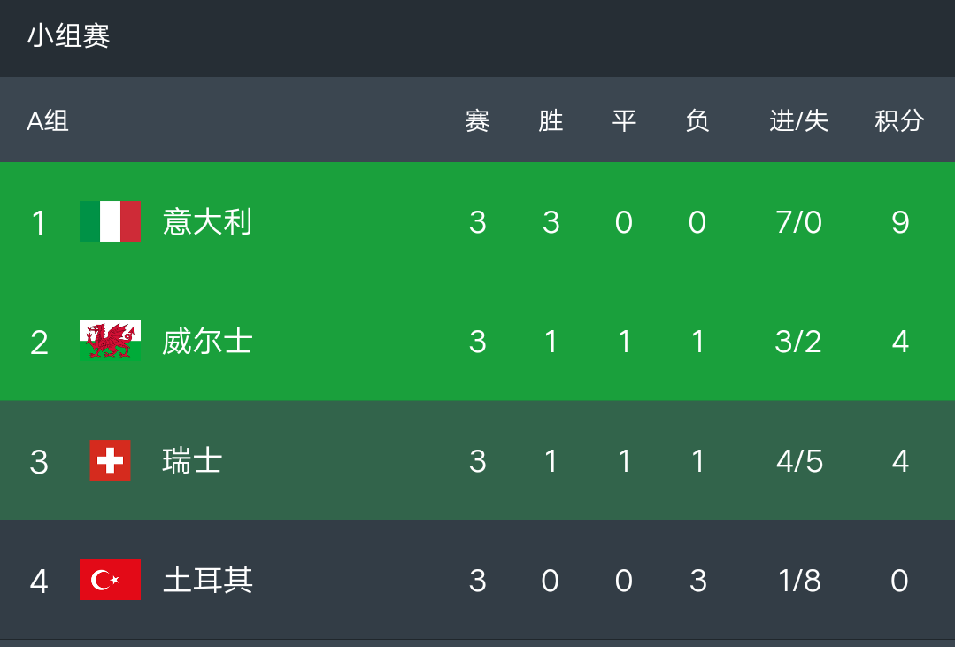 北京时间6月21日,欧洲杯A组第三轮的比赛全部结束,其中意大利1-0击败了威尔士,轰出三连胜,瑞士3-1土耳其,目前在最新的积分榜上,意大利锁定第一晋级,威尔士第二晋级,瑞士第三仍有很大晋级机会,土耳其3战全败垫底耻辱出局!