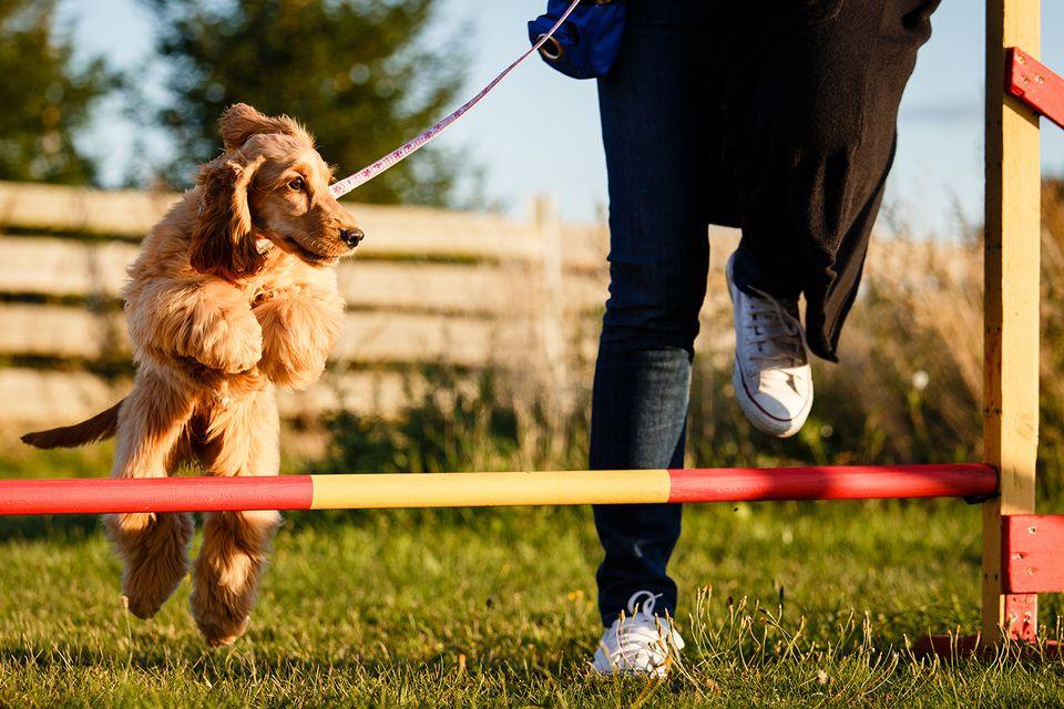 当兽医允许狗狗接受训练之后,狗狗就开始学习跳跃了。一开始不要把栏杆设置得太高,对于大型和中型犬,保持栏杆离地2.5或5厘米;而对于较小的品种,你可以直接把栏杆放在地面上,让狗狗慢慢适应。