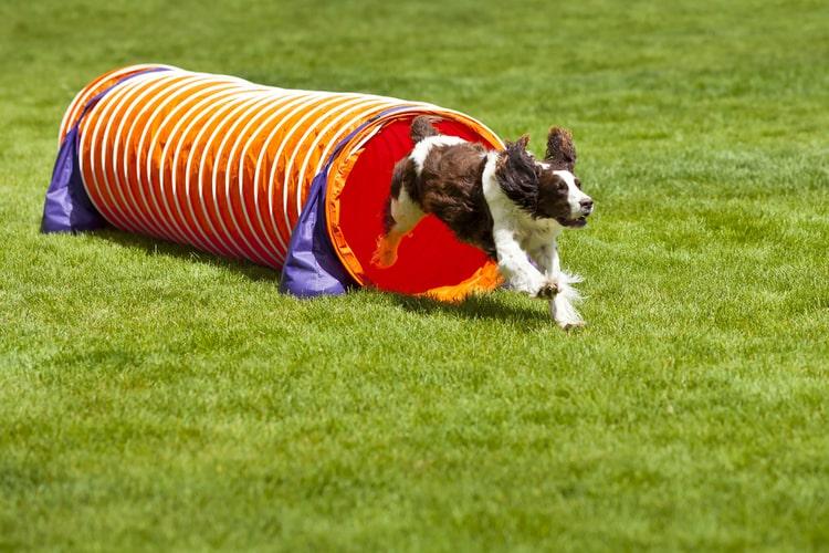 隧道通常是一个比较容易教学的障碍。通常从一个短的隧道开始,在隧道的出口放一些食物或者狗狗最爱的玩具,引诱狗狗通过隧道。同样地,在开始之前也需要让狗狗了解指令。如果狗狗在隧道面前犹豫不决,你可以在里面扔一些东西,大多数狗狗很快就会好奇地跑到另一边。当狗狗熟悉之后,你可以让狗狗通过更长的隧道。