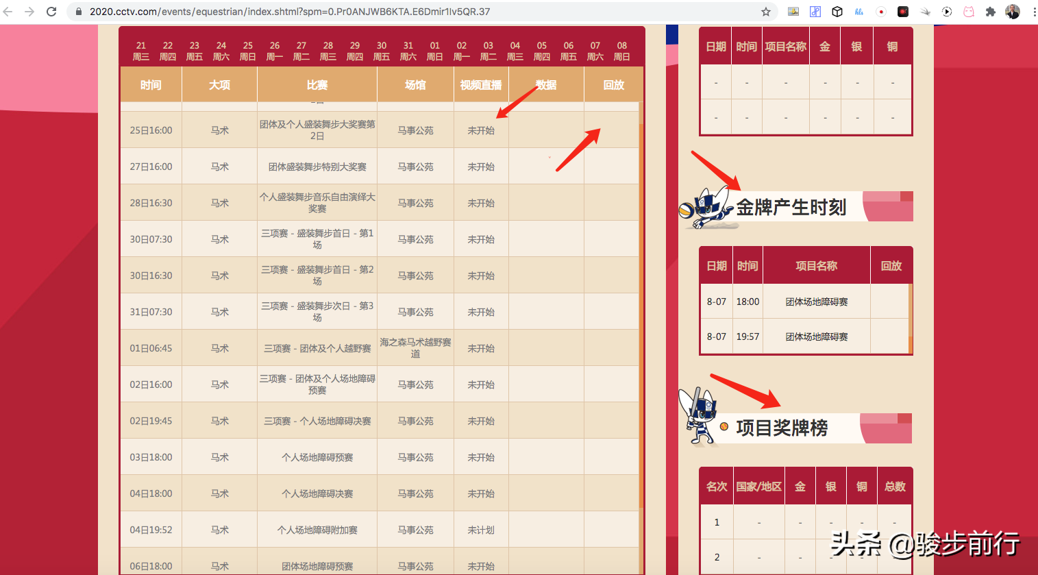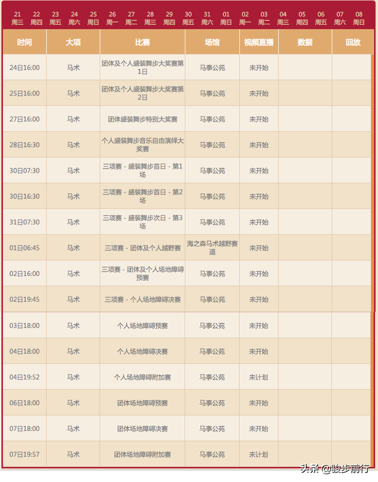 先上一张马术项目的赛程表,根据这个马术赛事安排表安排时间来追“马”。