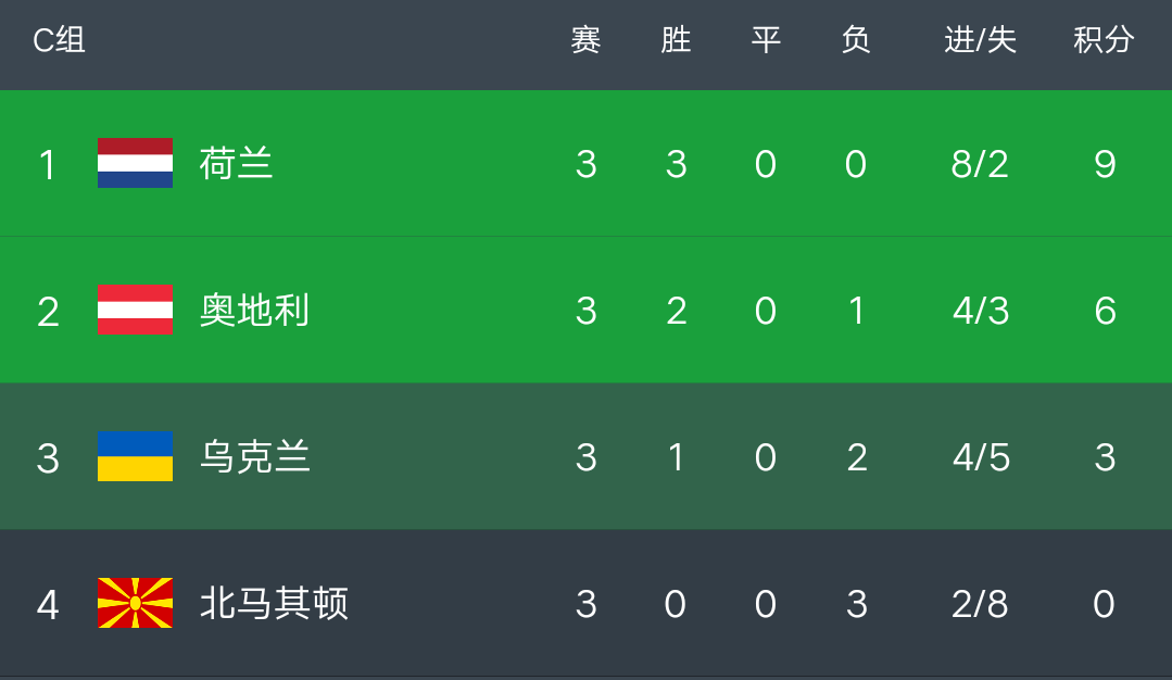 C组:跟B组的情况差不多,同样是在两轮过后出现“6330”,不同的是2轮0分垫底的北马其顿已经出局了。因为他们前2场输给了小组第2和小组第3的乌克兰和奥地利,所以哪怕最后一轮在荷兰身上爆冷拿到3分,但他们在跟奥地利和乌克兰的相互战绩对比都处于劣势。乌克兰和奥地利可以踢“默契球”,双方各拿1分基本可以出线。