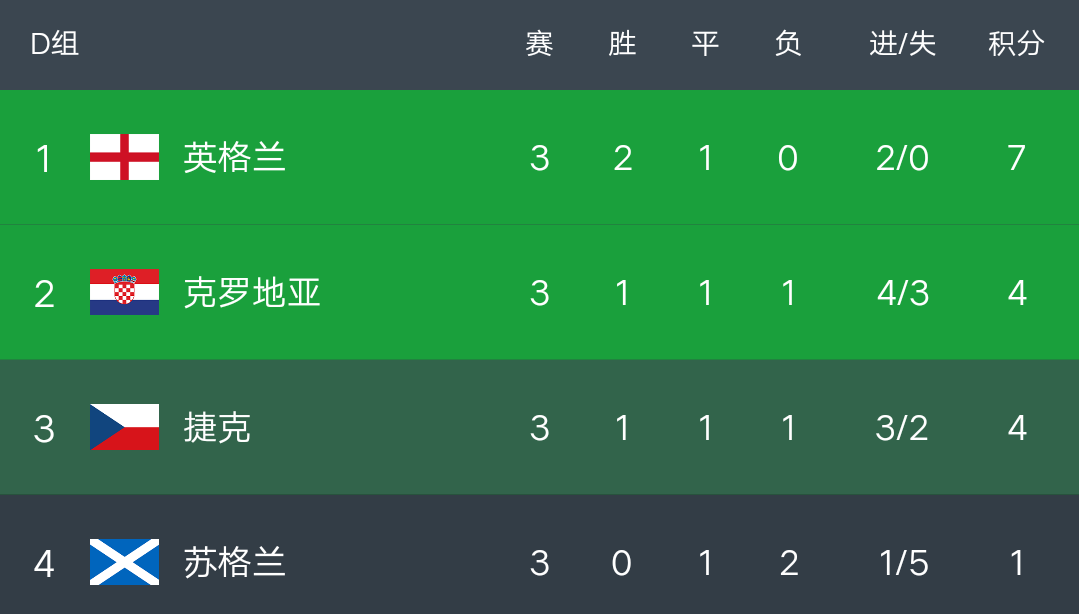北京时间6月23日,2020欧洲杯小组赛D组第3轮的比赛全部结束,在小组头名对决中,英格兰1-0力克黑马捷克,而克罗地亚则是3-1大胜苏格兰,目前在最新的积分榜上的,英格兰三战两胜1平积7分排名第一,克罗地亚积4分以净胜球优势排名第二,捷克积4分第三,苏格兰垫底出局,这样一来,英格兰,克罗地亚和捷克三队一同锁定了出线资格,杀进16强!