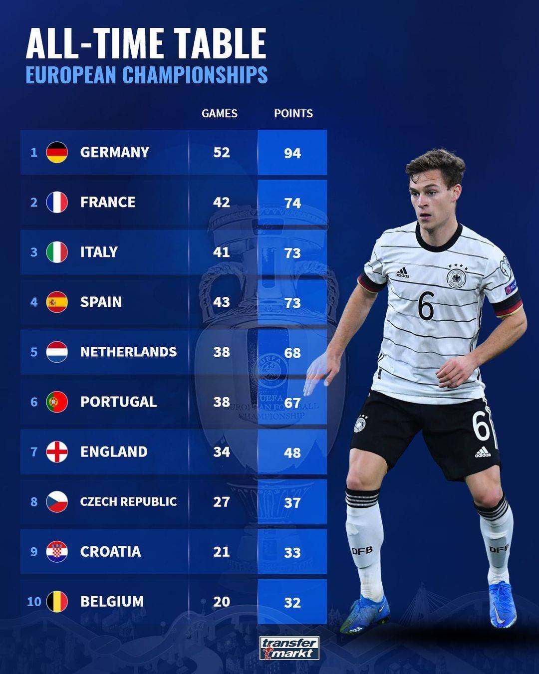 德国转会市场网站统计了欧洲杯历史积分榜,德国队以94分排名榜首,法国队排名第二。