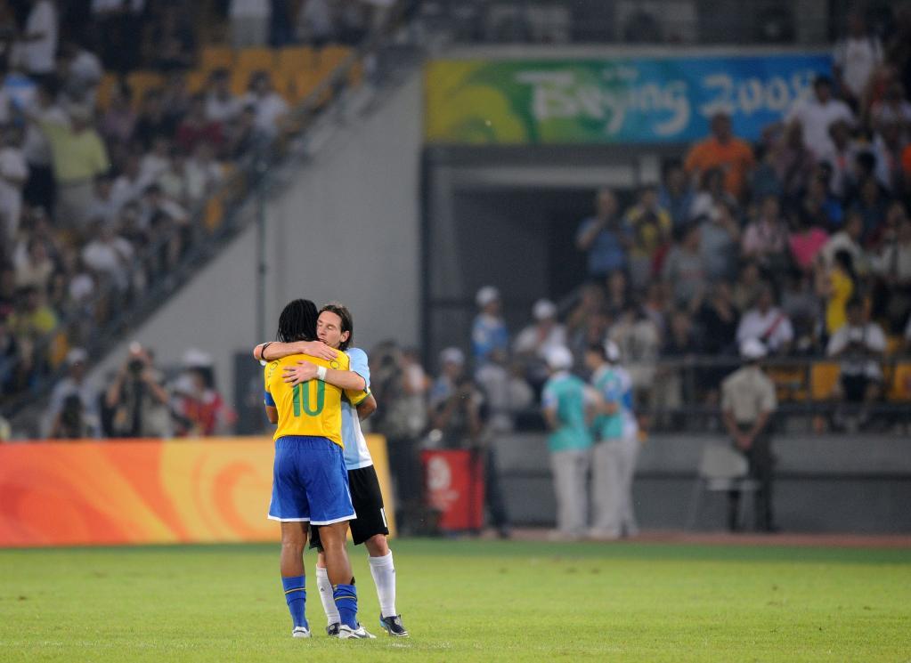 2008年8月19日,在北京工人体育场,阿根廷队球员梅西(右)在赛后安慰巴西队球员罗纳尔迪尼奥。新华社记者李钢摄